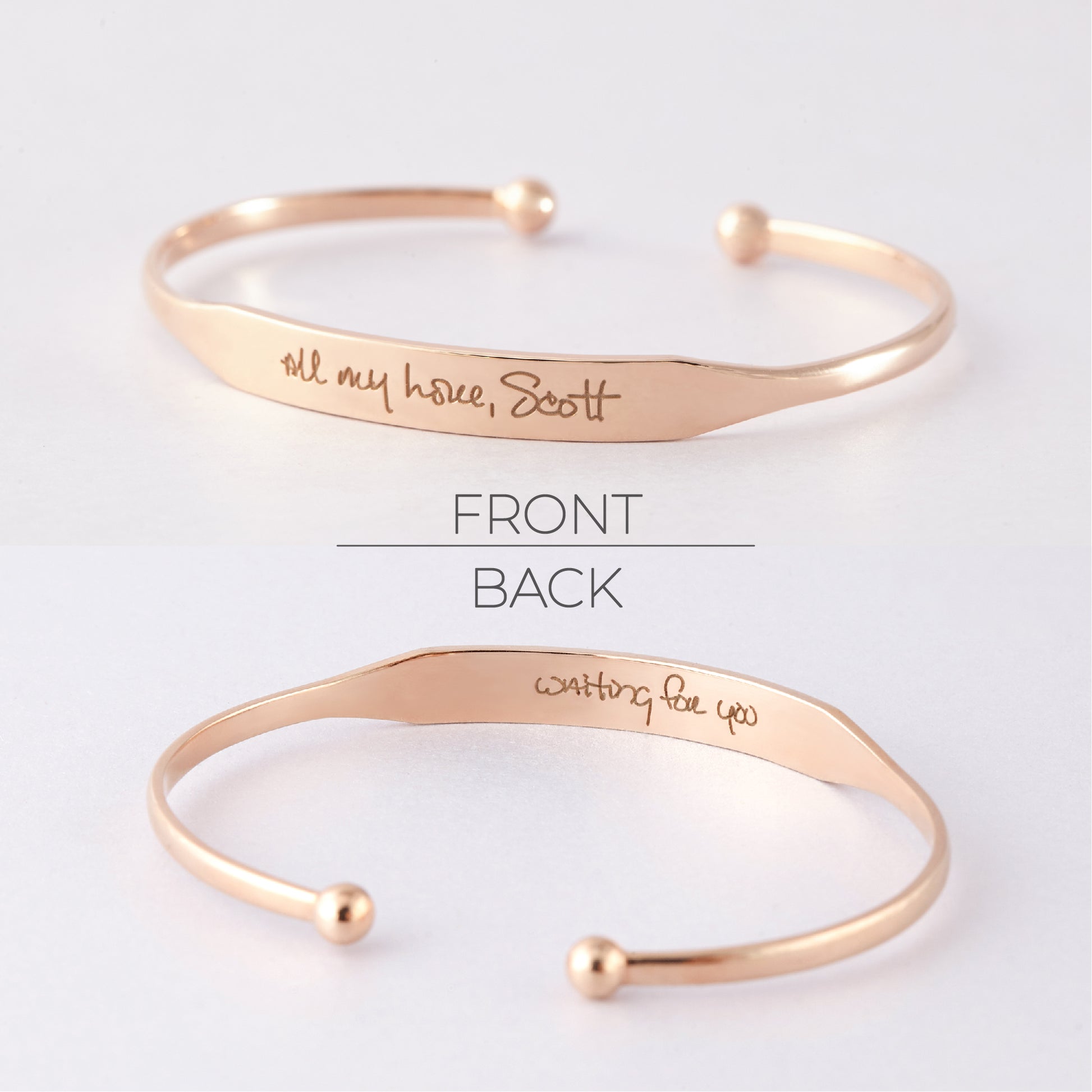 Wear a cherished memory. This personalized handwriting bracelet transforms words from any handwritten note into a meaningful keepsake, with customization available for both outside and inside engravings.